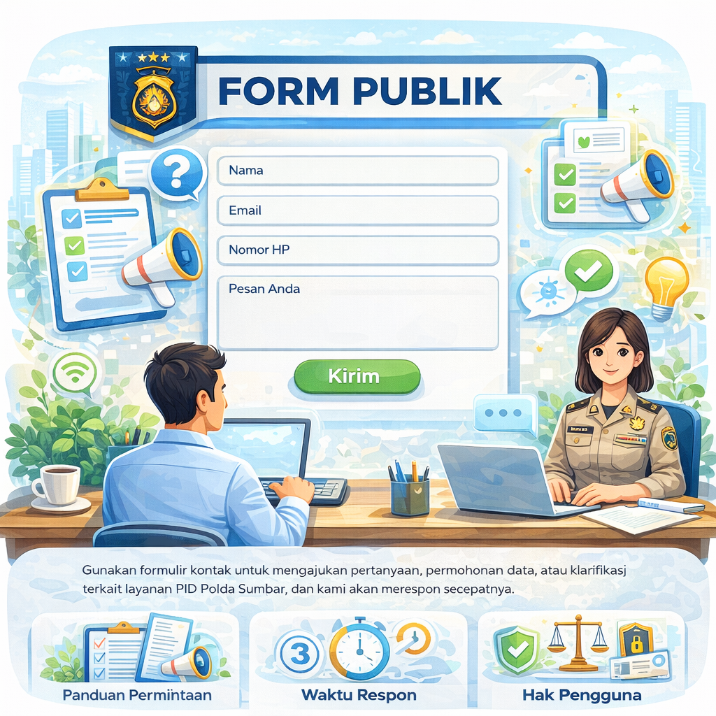 Gunakan formulir kontak untuk mengajukan pertanyaan, permohonan data, atau klarifikasi terkait layanan PID Polda Sumbar, dan kami akan merespon secepatnya.